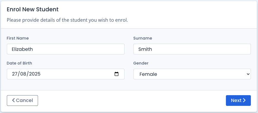NOTE: The new Student's profile will not be created until the enrolment is confirmed. If the process is abandoned or the student's age falls outside of your configuration settings, the student will not be created as a booking is not finalised.