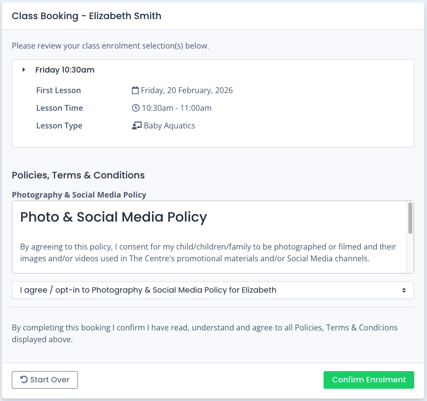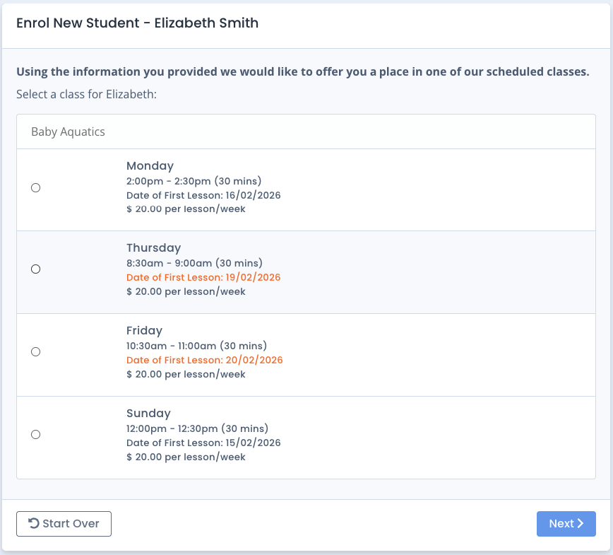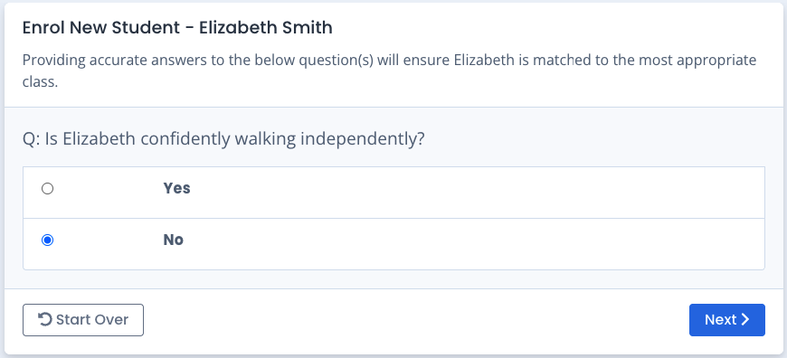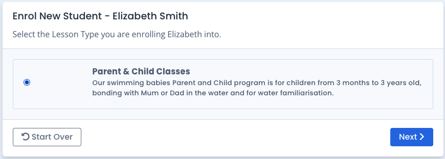 The family would follow the configured questions (if any) on the selected enrolment type to find available bookings.
